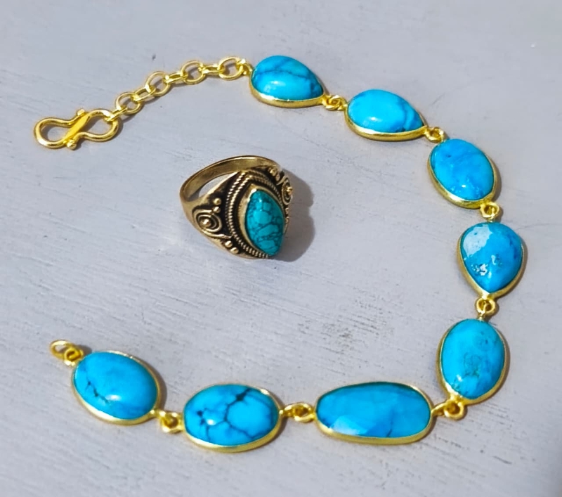 Elegante conjunto compuesto por anillo y pulsera en latón dorado, con piedras turquesa natural facetada que aportan brillo y sofisticación. Pulsera con cierre mosquetón y cadena de extensión. Anillo con diseño trabajado en relieve, estilo artesanal. Piezas traídas de Jaipur, India, reconocida por su tradición en joyería artesanal.