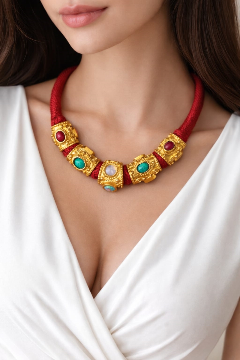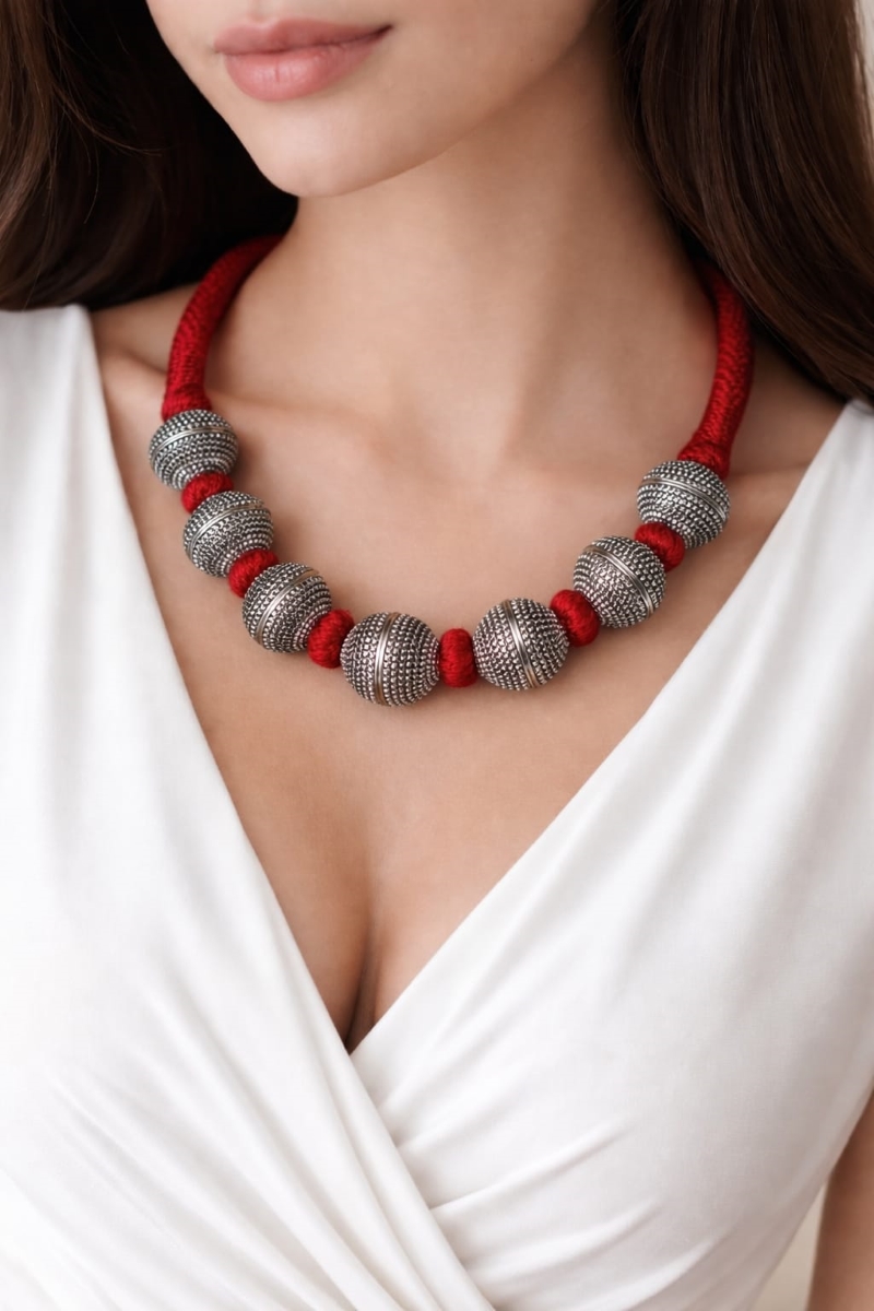 Bisuteria Boutique Collar Etnico Cordon Rojo con 7 Esferas Texturadas Jaipur India