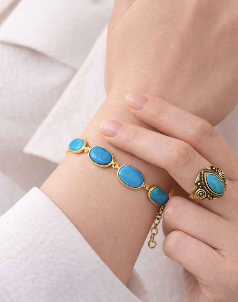 Conjunto Anillo + Pulsera en Dorado con Piedra Turquesa Natural Jaipur – India
