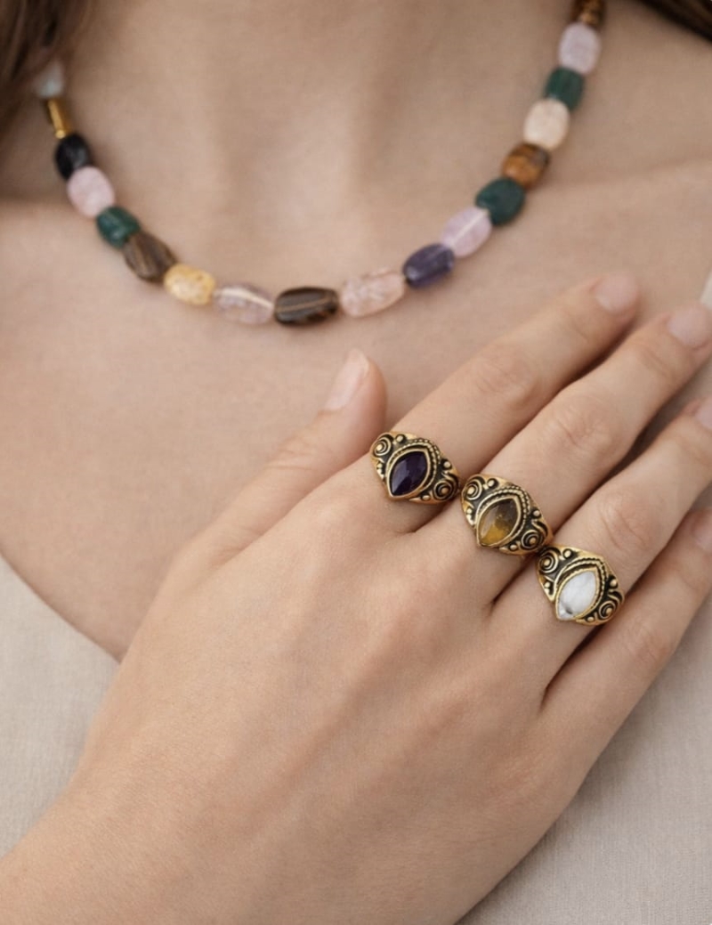 Bisuteria Boutique Set Collar de Piedras Naturales + 3 Anillos a Juego Jaipur -India